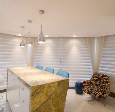 A persiana double vision Da Luz & Trama é uma persiana de rolo, que sobe e desce enrolando, e é formada por dois painéis que possuem faixas intercaladas de tecido e de tela.